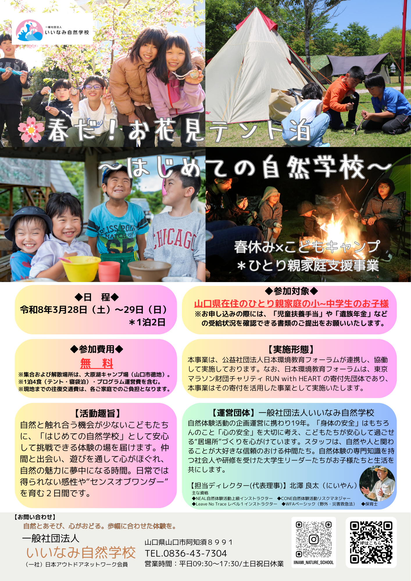山口県在住のひとり親家庭支援事業として、春休みに参加費無料のキャンプを実施いたします。先着順となりますので、お早めにご検討ください。